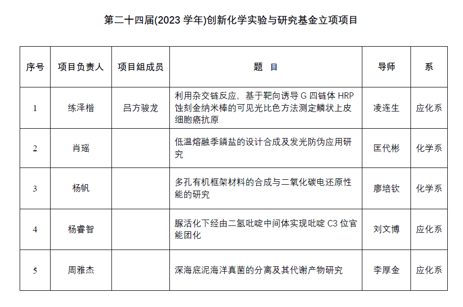 化学实验教学中心《关于申请“第二十四届(2023学年)创新化学实验与研究基金”项目的通知》文精神,经学院专家评审,决定对《利用杂交链反应,基于靶向诱导G四链体HRP蚀刻金纳米棒的可见光比色方法测定鳞状上皮细胞癌抗原》等5个项目予以立项,资助经费5000元/项目。具体的名单见下表或附件1。