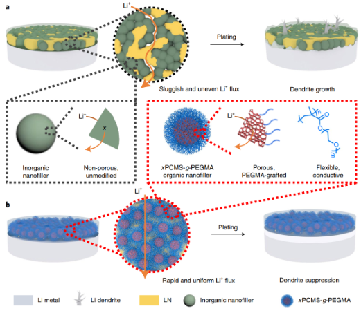 锂金属—电解液界面通常组分不均一且稳定性差,容易引发不可控的锂枝晶生长,并迅速降低电池的循环稳定性,从而严重阻碍锂金属电池的实际应用。有鉴于此,直播平台 吴丁财教授和刘绍鸿副教授等人最近通过多孔高分子刷(超交联聚4-氯甲基苯乙烯纳米球表面接枝聚(低聚乙二醇)甲基丙烯酸甲酯,简称为xPCMS-g-PEGMA)与单离子导电锂化Nafion树脂的合理集成,发展了一种坚固的全有机人工界面保护层,由此获得了高效的无枝晶锂金属负极。具有刚性超交联骨架的多孔xPCMS内核不仅显著提高了人工保护层的机械强度,还可提供快速的锂离子传输通道;与此同时,柔性的PEGMA 侧链以及锂化Nafion树脂有利于形成结构稳定、锂离子扩散均匀且锂离子迁移数高的人工保护层。在该人工固体电解质界面层的保护下,锂金属负极可在10 mA cm-2的超高电流密度下实现超过9100小时(>1年)的超长稳定循环,并在10 mAh cm-2的大面容量下实现超过2800小时的稳定可逆锂沉积/剥离。进一步地,当与高载量正极(~4 mAh cm-2)配对时,受保护的锂负极也显示了出色的电池稳定性,说明实际应用前景广阔。