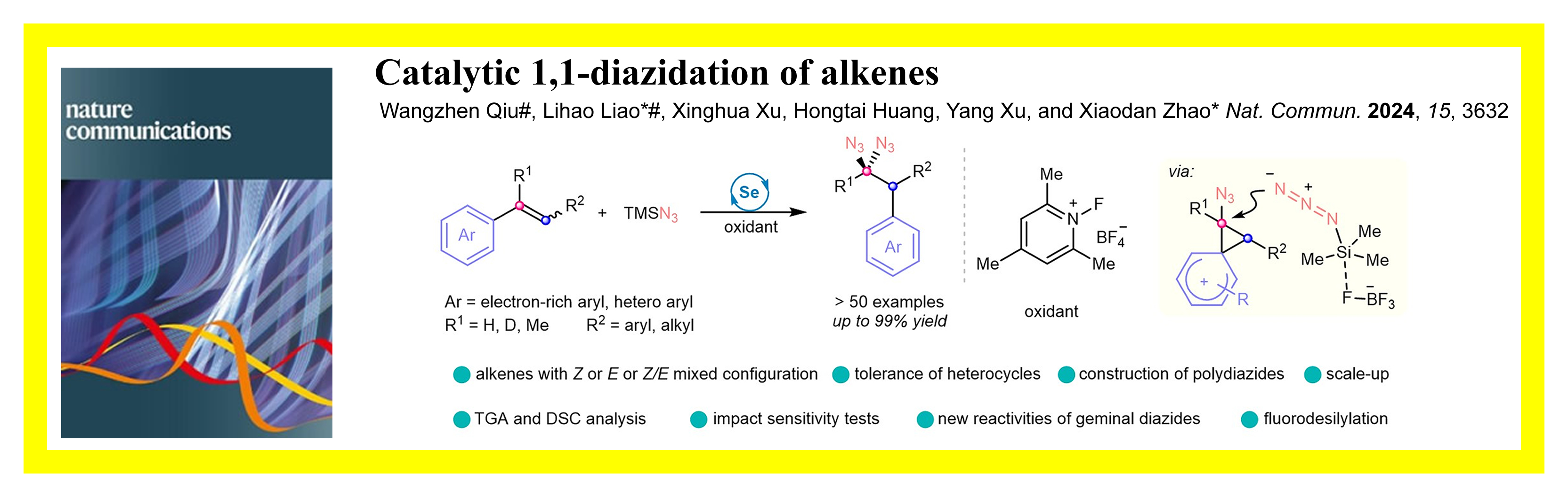 Posted 2024.04.29 Congratulations! The publication of our group in Nat. Commun., "Catalytic 1,1-diazidation of alkenes" has been published recently (Wangzhen Qiu#, Lihao Liao*#, Xinghua Xu, Hongtai Huang, Yang Xu, and Xiaodan Zhao* Nat. Commun. 2024, 15, 3632, #These authors...
