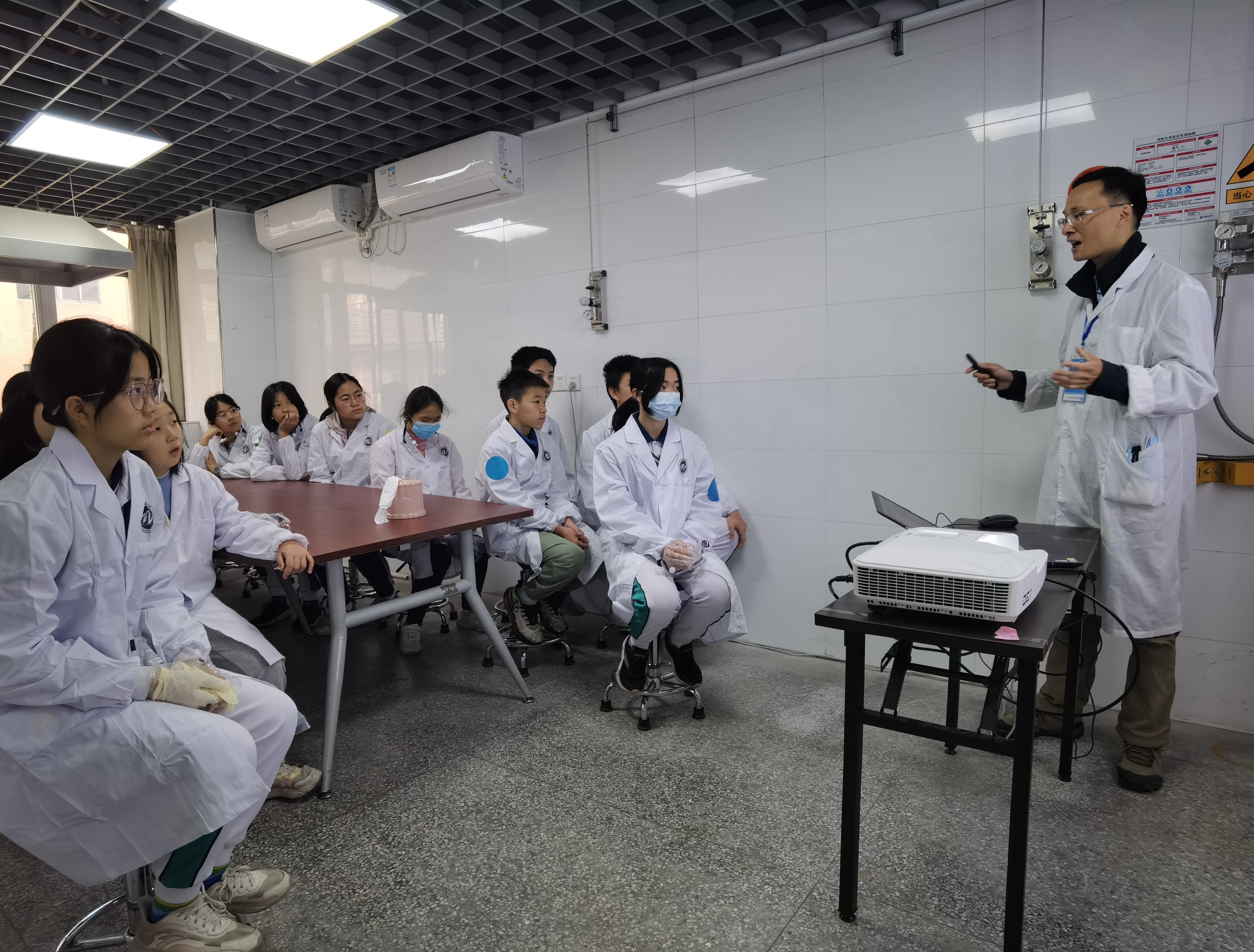 科普实践课堂分为集中讲解、实验操作体验、总结座谈、颁发证书四个环节进行。实验教学中心林志强老师以“什么是化学“的问题入手,通过视频、图片等形象生动地为学生们讲解化学实验与安全相关基础知识,并与学生们展开了积极热烈的问答互动。