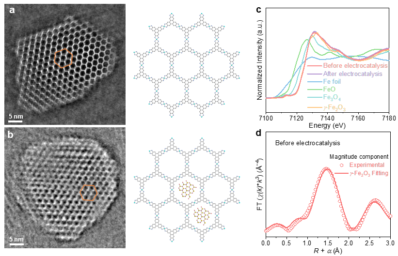 图2:γ-Fe2O3@Ni-HITP的形貌和结构表征。a, 沿着[001]面Ni-HITP的iDPC-STEM图像。 b, 沿着[001]面γ-Fe2O3@Ni-HITP的iDPC-STEM图像。橙色六边形实线中展示了当沿着孔道方向,观察到一些相反对比度的分散的亮点,表明在Ni-HITP中均匀分散的γ-Fe2O3纳米颗粒。c, Fe箔,FeO,Fe3O4,γ-Fe2O3和γ-Fe2O3@Ni-HITP的Fe K-edge XANES谱。d, γ-Fe2O3@Ni-HITP中γ-Fe2O3的EXAFS谱拟合曲线。