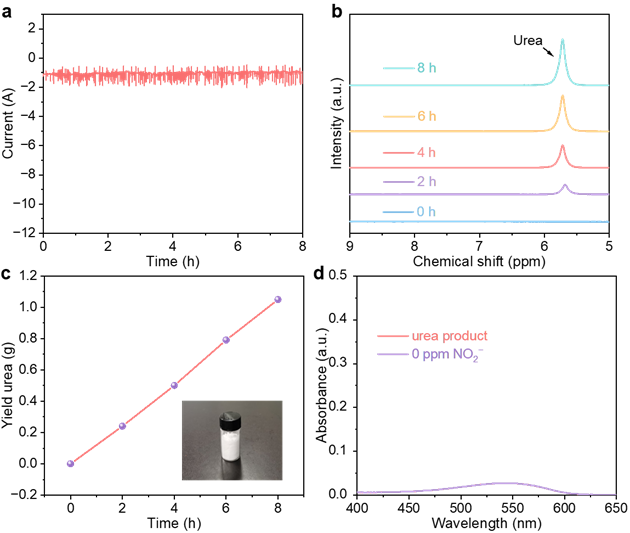 图4:使用具有较大窗口(5*5 cm2)的流动池时电催化CO2和NO3−共还原合成urea的性能。a, CO2饱和的0.1 M KHCO3 + 0.04 M KNO3电解液中,催化剂负载量为0.36 mg cm−2,−0.8 V vs. RHE时8小时性能测试i-t曲线。b, 不同时间urea产物的1H NMR谱图。c, 不同时间的urea产量。插图:8小时产生的urea。d, 纯化后的urea产物和0 ppm NO2−的紫外检测结果,证明提纯后urea产物中无NO2−。