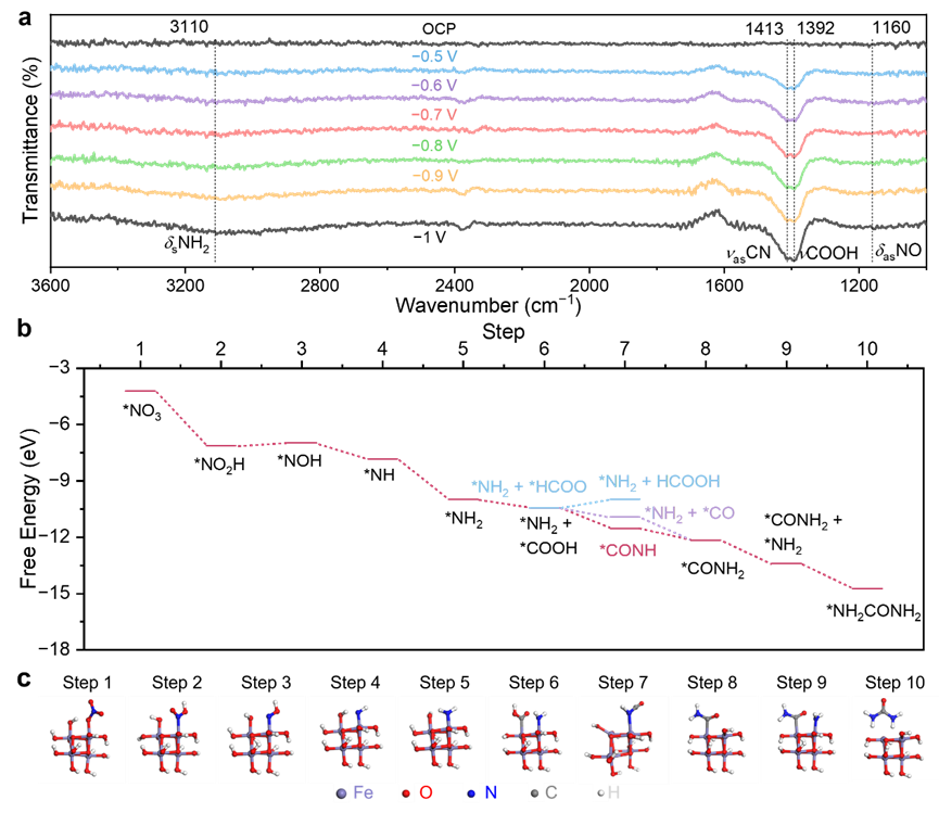 图5:电化学共还原CO2和NO3−反应机理的研究。a, 0.1 M KHCO3 + 0.04 M KNO3电解液中不同电位下电化学共还原CO2和NO3−的Operando ATR-FTIR谱。b, 共还原CO2和NO3−时提出的反应路径和自由能变化图。当存在*NH2中间体时,不论是*HCOO还是*COOH中间体都倾向于与*NH2中间体偶合而不是进一步还原和脱附。c, PDFT计算中每一步相对应的结构模型。