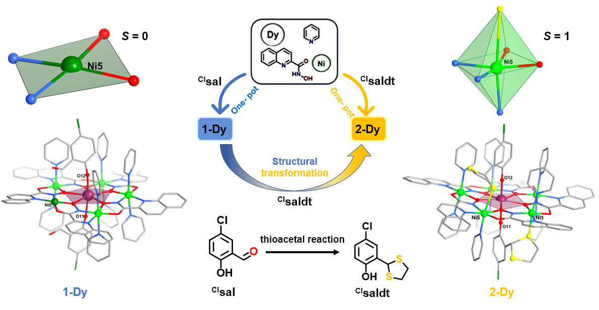 该工作利用DyIII与[15-MCNi-5]金属冠醚以及5-氯水杨醛负离子分别在赤道平面和轴向进行配位,构筑了一例五角双锥d-f单分子磁体(1-Dy)。醛基的空间位阻导致[15-MCNi-5]环中的一个NiII呈现平面四边形几何构型。通过对5-氯水杨醛进行硫缩醛后修饰,得到了化合物2-Dy。利用红外、质谱和X射线衍射技术对转化过程进行反应跟踪,发现经过硫缩醛后修饰,不饱和的平面四配位NiII在轴向上与二硫戊环基的硫原子配位,配位几何转变为变形八面体,自旋态也由抗磁的低自旋态(S = 0)切换至顺磁的高自旋态(S = 1)。而且,CISSS发生前后,磁性分子的结晶空间群由中心对称(P21/c)转变为非中心对称(P21),实现了非线性光学中二次谐波效应的从无到有。相应地,单分子磁体性能得到了显著改善,有效能垒从57 cm−1提高至423 cm−1,2 K磁滞回线矫顽场增加了200多倍——从50 Oe增至10.45 kOe。