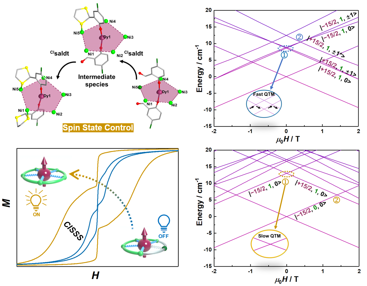 刘俊良/童明良团队通过分子设计,精准合成了一种镝-过渡金属冠醚单分子磁体。通过硫缩醛反应,第一次在单分子磁体中引入了CISSS,实现了在磁耦合协同下的分子磁性调控。