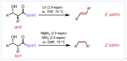 烯烃是天然产物、药物、农药和香料等高价值分子的重要砌块和前驱体,其选择性合成在有机合成中至关重要。目前通过消除过程合成烯烃的方法主要包括 Chugaev 消去, Burgess 消去法, Sharpless-Grieco 消去和过渡金属促进消去等。但是这些方法仍然存在一些缺点,例如温度过高、对水氧敏感或者试剂有毒、价格昂贵等。更重要的是,这些方法通常会产生不可分离的 E/Z 异构体混合物。即使是得以广泛应用的 Wittig 反应,依然会不可避免地会产生两种异构体。因此,制备高选择性的 E/Z 异构体的方法具有较大价值,但同时也具有较大的挑战性。