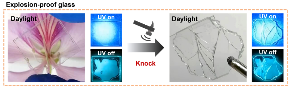图2. TpB@PVB薄膜的力学性能及防爆玻璃的应用