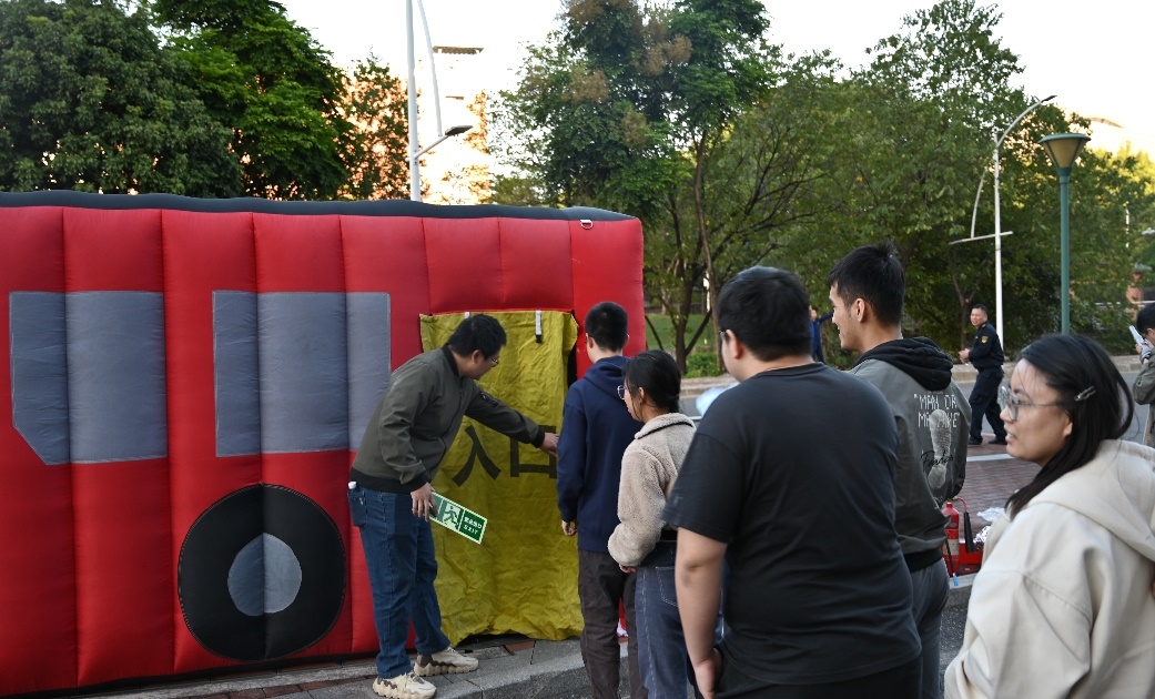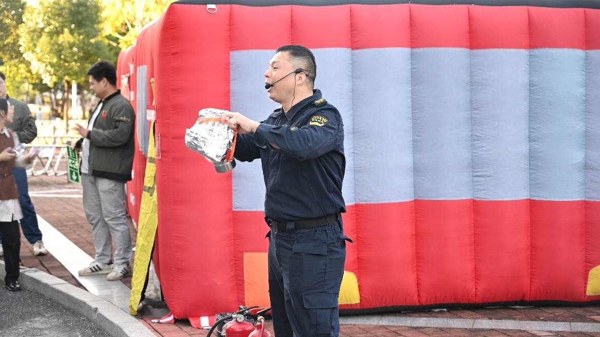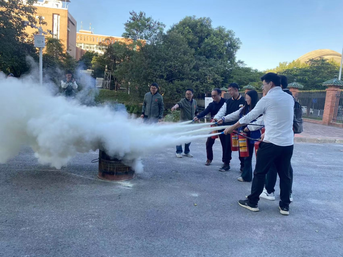 最后,学校保卫处在化学材料综合楼北侧空地置放消防器材和逃生帐篷,为直播平台师生开展灭火器使用培训并提供逃生帐篷体验指导。