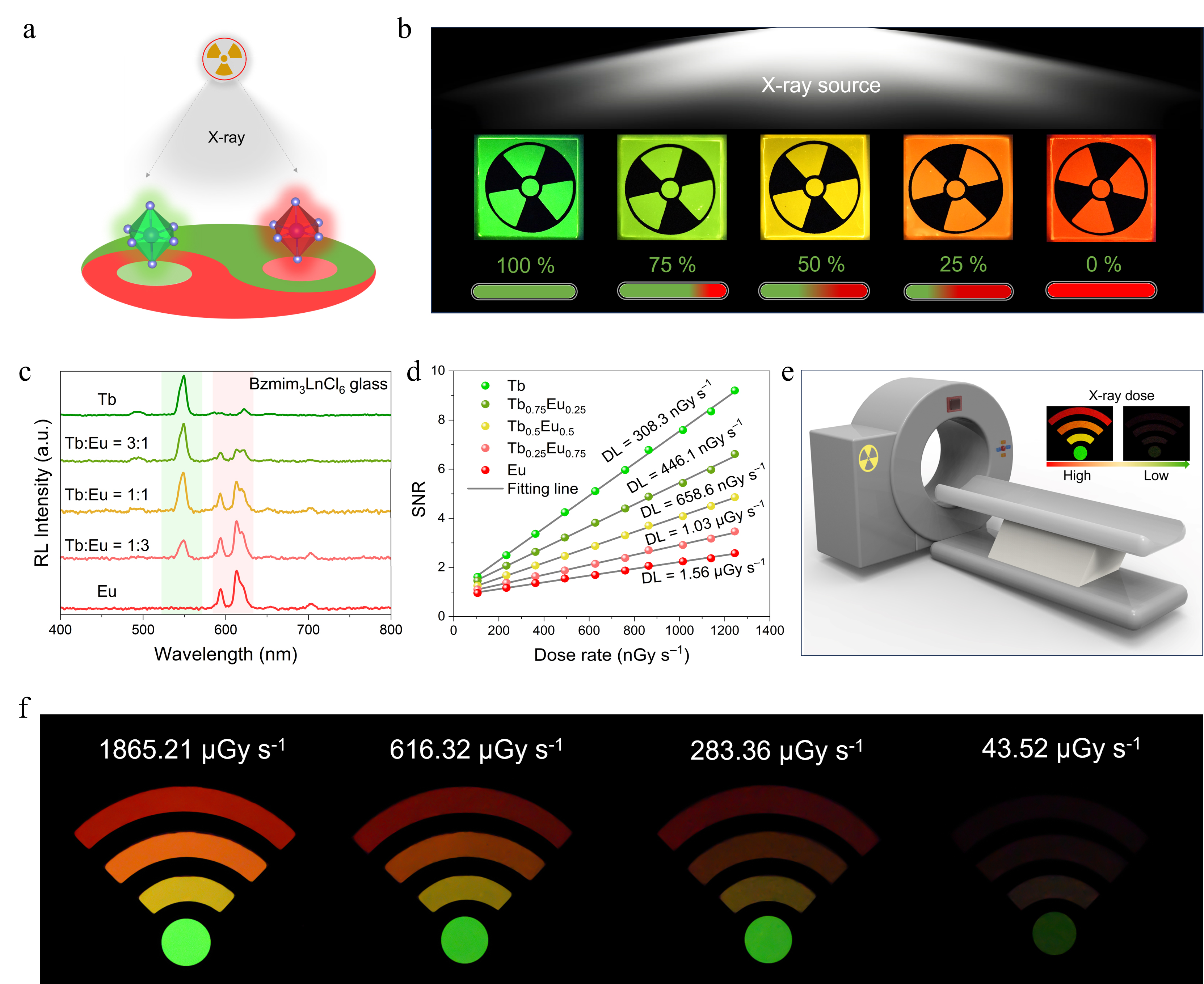 近日,匡代彬教授团队率先报道了一种新型无定形有机–无机杂化稀土卤化物发光玻璃Bzmim3LnCl6(Bzmim = 1-苄基-3甲基咪唑;Ln3+ = Tb3+, Eu3+)。通过调控玻璃中Tb3+与Eu3+的比例,研究团队成功地在X射线辐照下实现了从绿色到红色的可控辐射发光,值得注意的是,此类有机–无机杂化稀土卤化物玻璃对X射线剂量变化表现出显著的高灵敏度,预示了其在多色可视化辐射探测领域的良好应用前景。此外,Bzmim3TbCl6玻璃在480–800 nm波长范围内表现出优异的可见光透过率(> 85%),使其在X射线成像中实现了高的空间分辨率(> 25 lp mm-1)。该研究不仅为有机-无机杂化稀土卤化物玻璃的设计与开发提供了重要范例,也展现了其在辐射探测、光学传感、照明显示等方面的应用潜力。